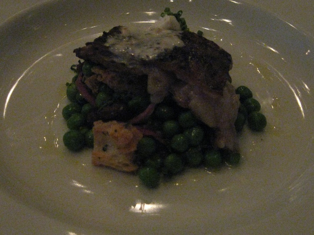 This was grilled lamb belly, peas, mint, whipped crème fraîche. Aaron is wild about lamb, if he is not on a vegan week or month it’s his go to for fancy food.The peas were gorgeous, clearly fresh from the market that morning. And this is a very large appetizer portion – and a deal at $11.00.