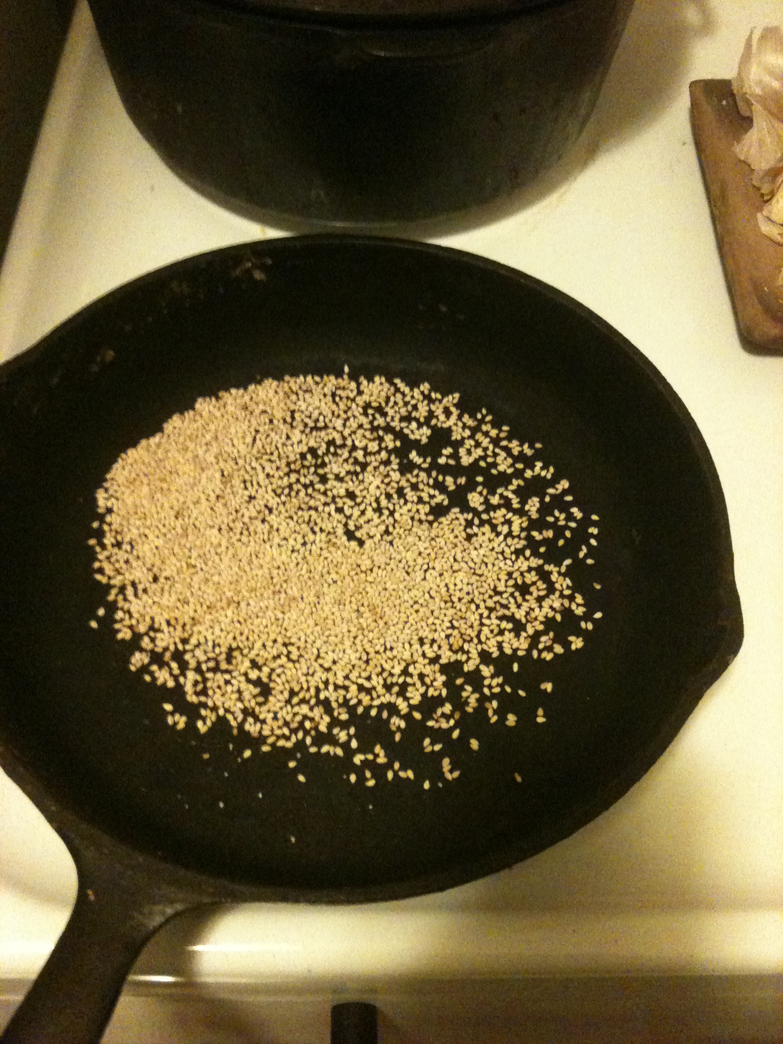 Next step in the prep is to toast some sesame seeds in a dry cast iron, who could refuse? I’m sure this smells great, it kills me.