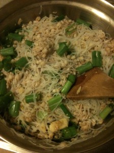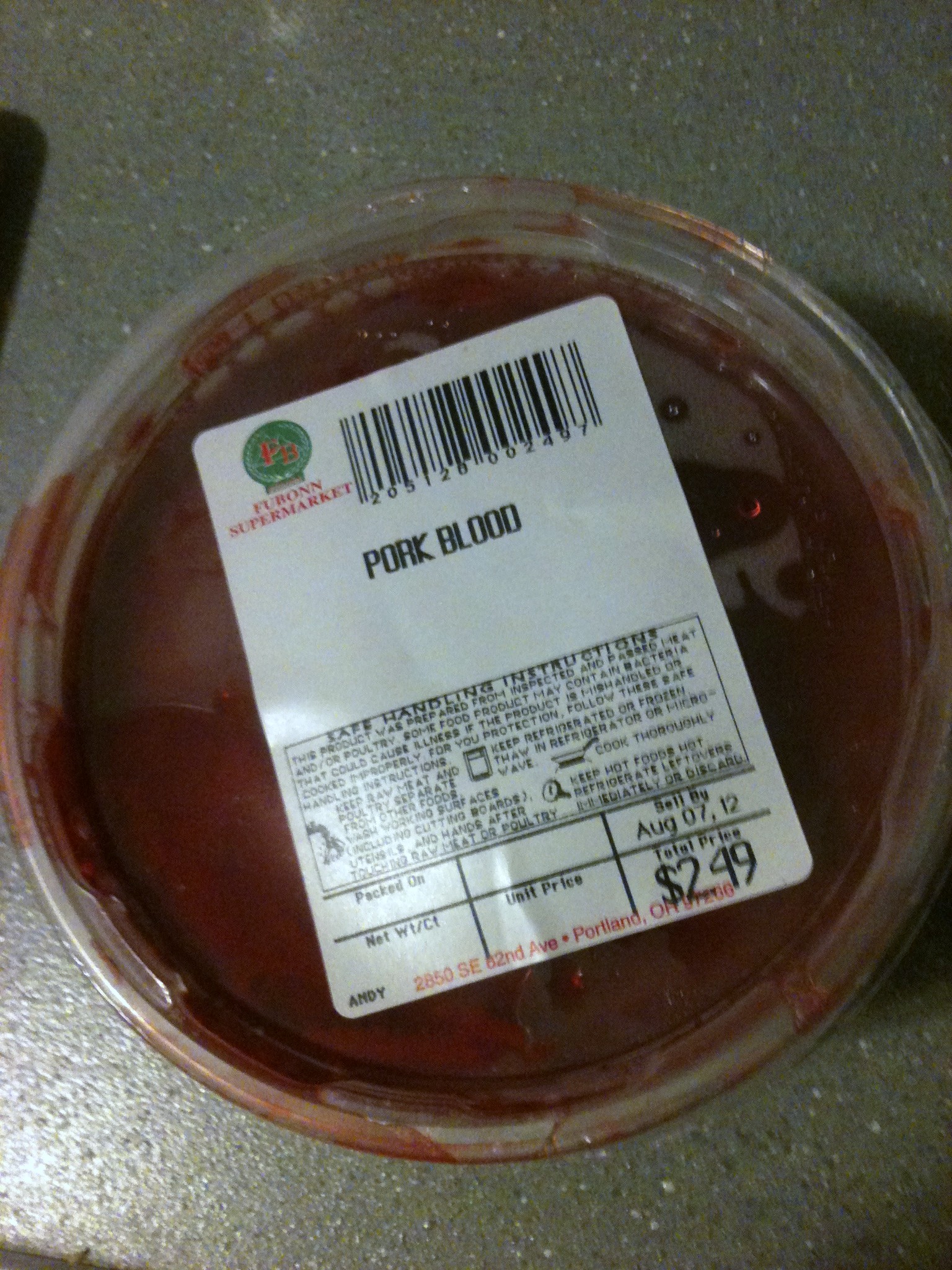 This, my wise vegetarian friends, is a snapshot just before I Bailed. Something about the way the blood oozed from the rest of the ingredients and  puddled at the base of the casings, well, I couldn’t take it. I wrapped the whole bloody mess in a 5-ply trash bag and walked it up to the compacter at the McDonald’s on Powell. I returned to hose my kitchen down with bleach solution and enjoyed a dinner of napa cabbage, tea eggs, oysters, and jellyfish – sans blood.