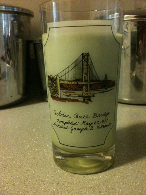 The fun part is to chop up fours stalks of beautiful PNW rhubarb and put that in a blender with some lemon juice and another 1/8 cup of raw agave. Once it’s a coarse puree you squeeze out the juice into a wide mouth pitcher. For this I used Aaron’s camping coffee maker, the kind that sits over a large nalgene bottle. It worked like a CHARM.