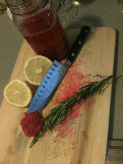 I threw Aaron a little party and made some Raw Rhubarb Rosemary Cocktails. I sort of used this recipe as my guide but I was not vibing on white sugar that day so I adapted and edited.
